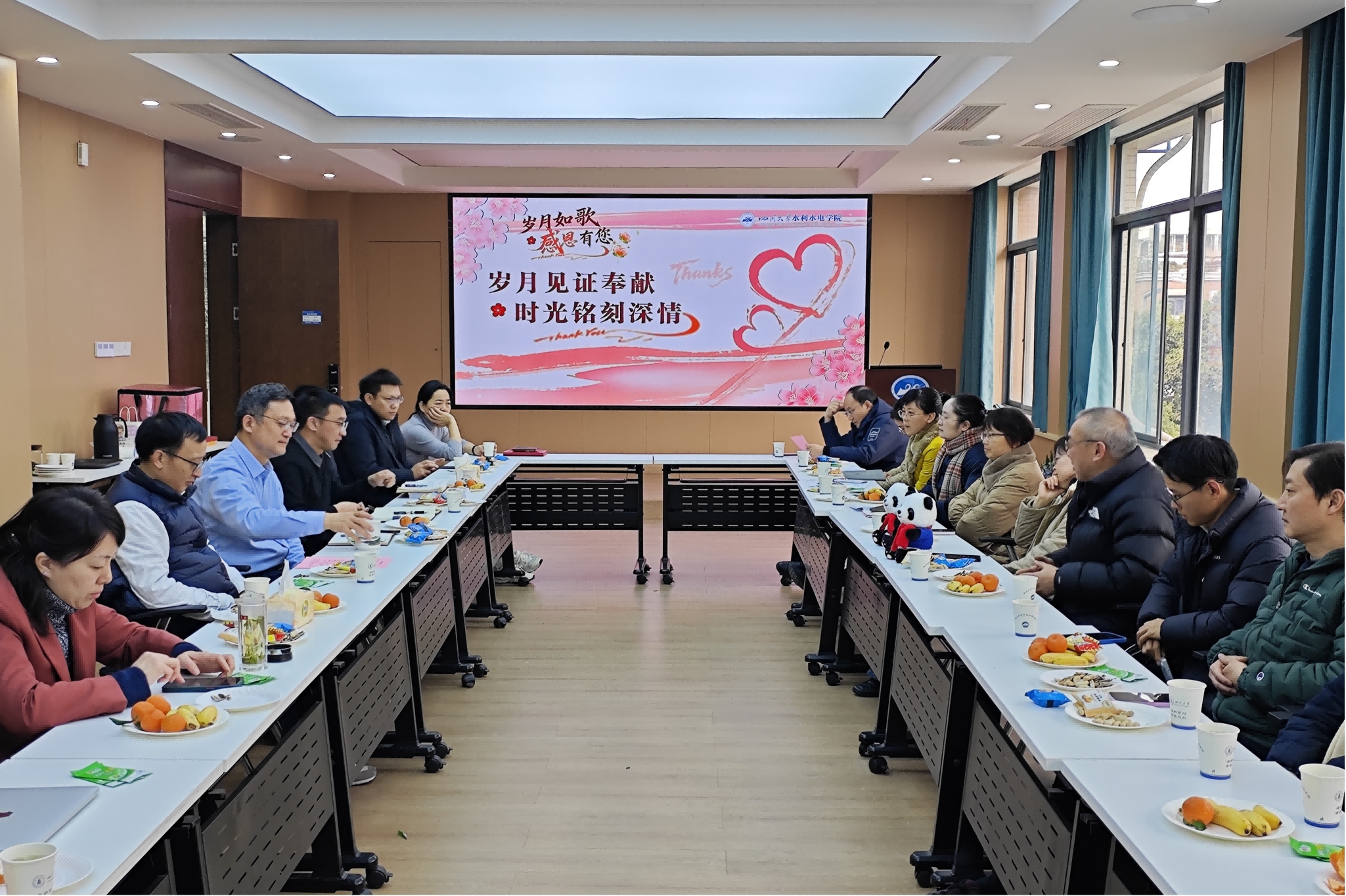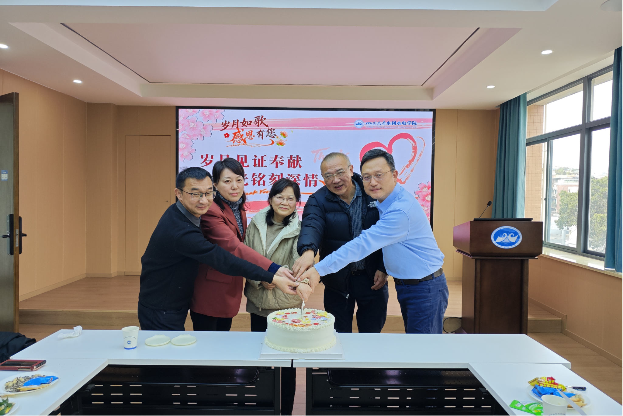 全体与会人员齐声合唱《相亲相爱一家人》,悠扬深情的歌声将现场的温情与敬意推向高潮,承载着水利水电学院这个大家庭深厚的情谊与美好的祝愿。仪式最后,大家共同分享纪念蛋糕并合影留念,为这场充满温情与敬意的欢送会画上圆满句号。